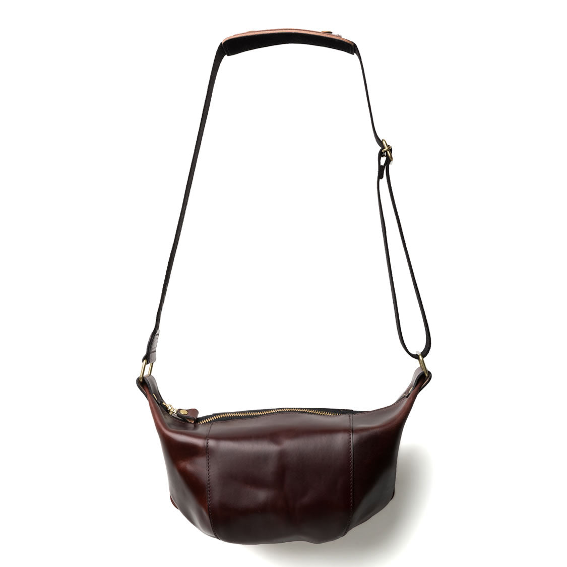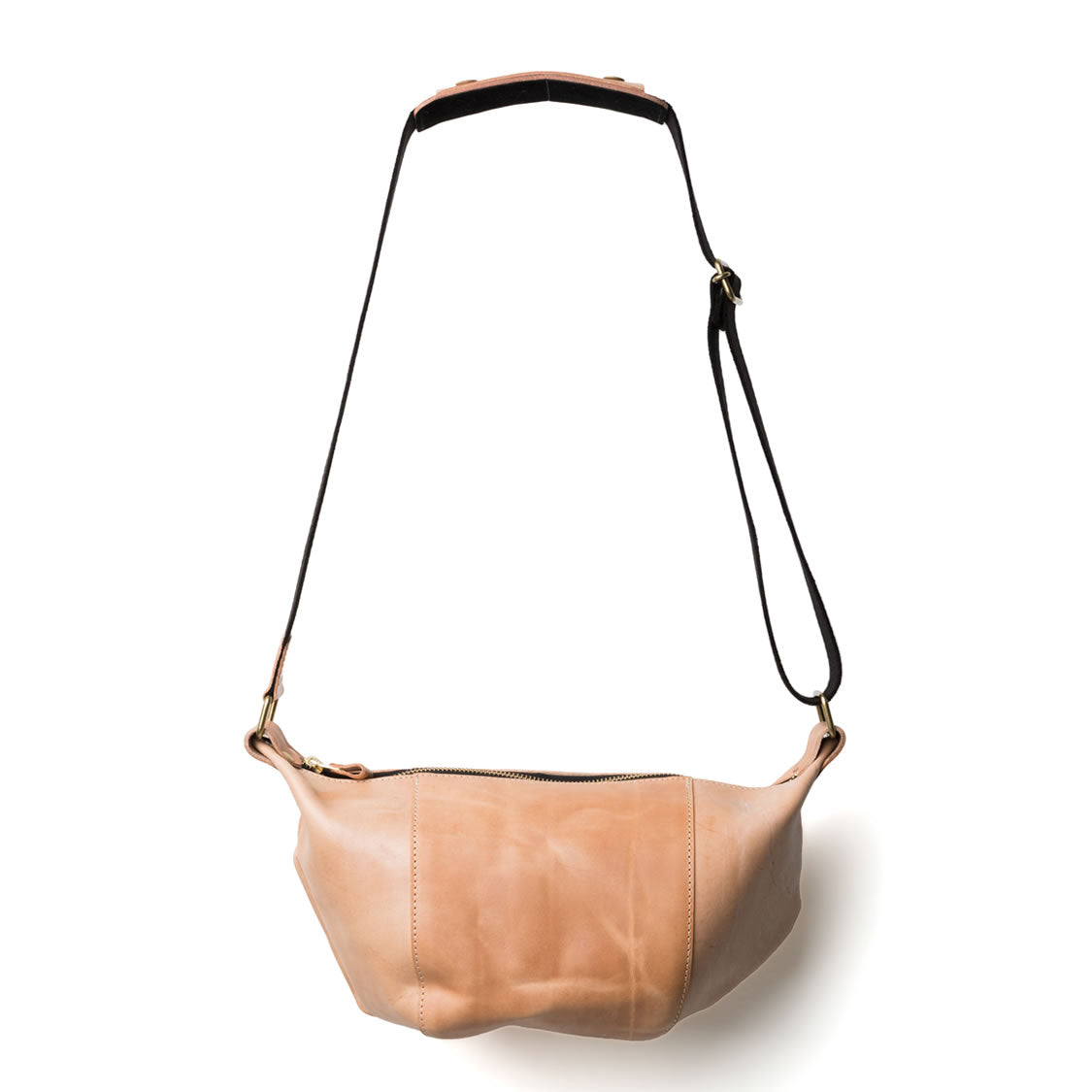 三枚に抜かれた革を三日月型に縫製することで膨らみとマチを作り出し、財布・ペットボトル・スマホなど持ち歩くのに必要なアイテムをスッキリ収納します。