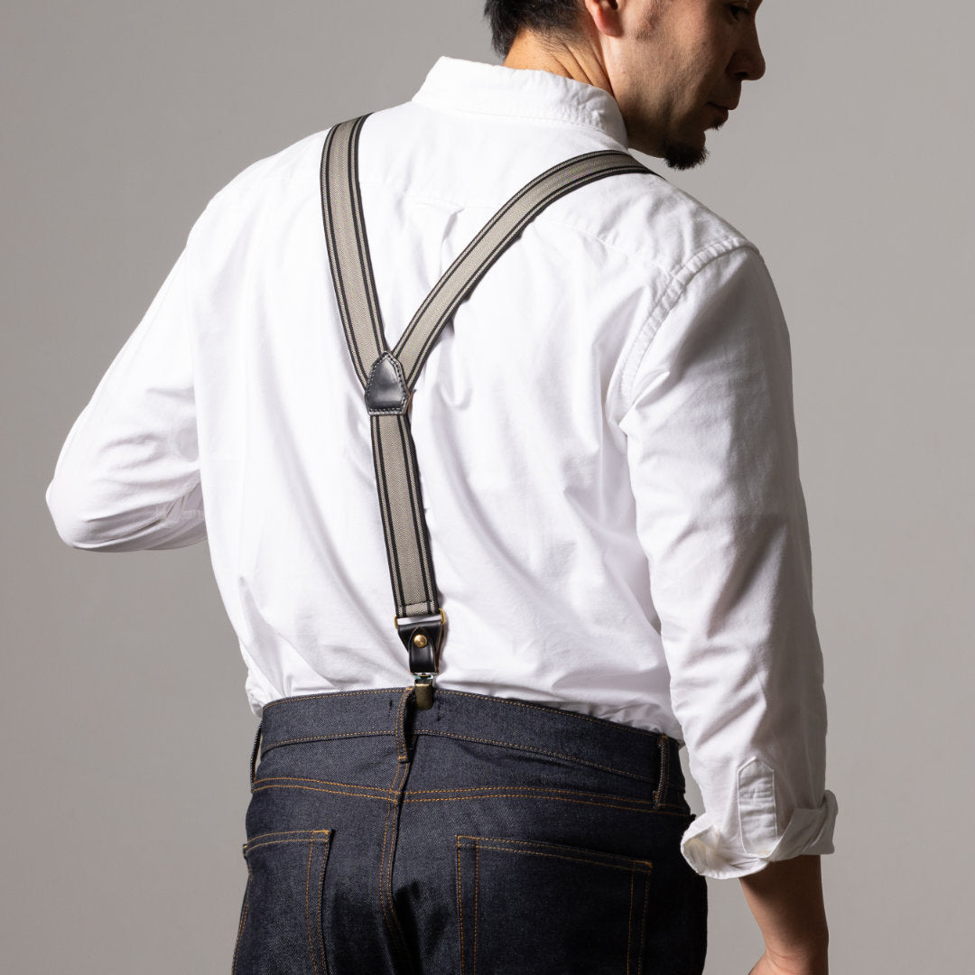 パンツを上から吊るす方式のため体型に関わらずしっかりと留めてくれるサスペンダーは、カジュアルなシーンだけでなく綺麗に着こなしたい時にも活躍します。
