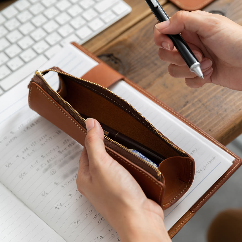 程よいサイズ感で作っていますので、携帯性に富みながら一般的なペンが7?8本ほど入る容量も確保しています。