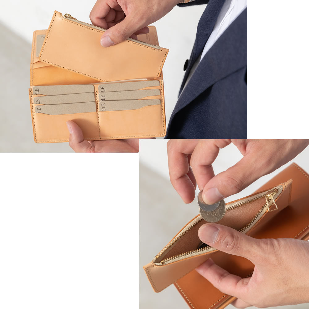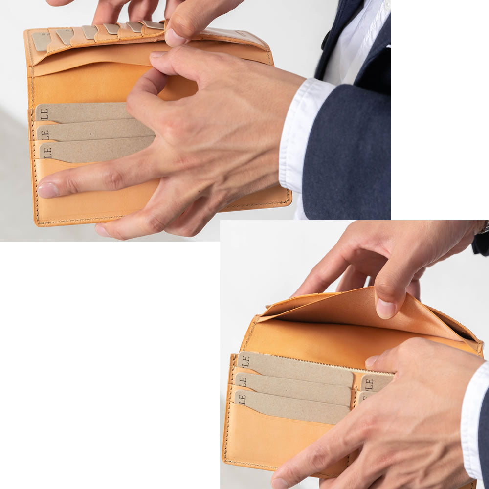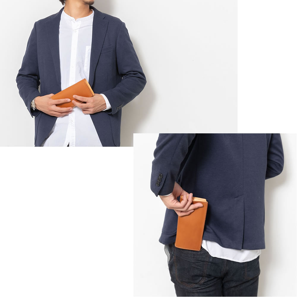 全体の厚みを約2.5cmに抑え、胸ポケットに入れてもスッキリと収まり、ビジネスシーンだけでなくオフタイムも、大人の雰囲気を魅せてくれます。
