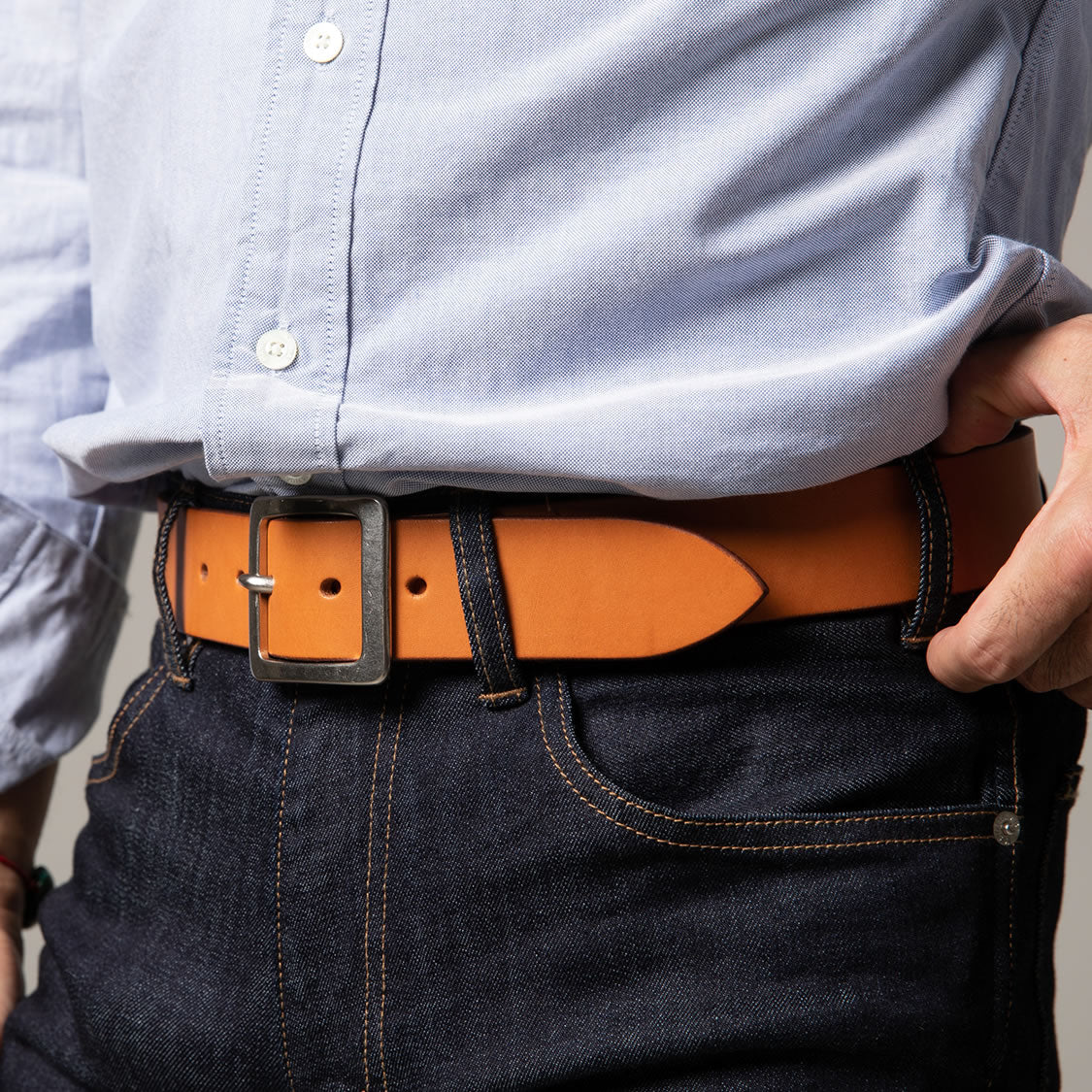 国内でクオリティの高いタンナーとして名高い「栃木レザー」に、別注で作ってもらった上質のオイルドレザー。近年では確保が難しい4mm以上の厚さの原皮にオイルをたっぷり含ませながら仕上げられています。
