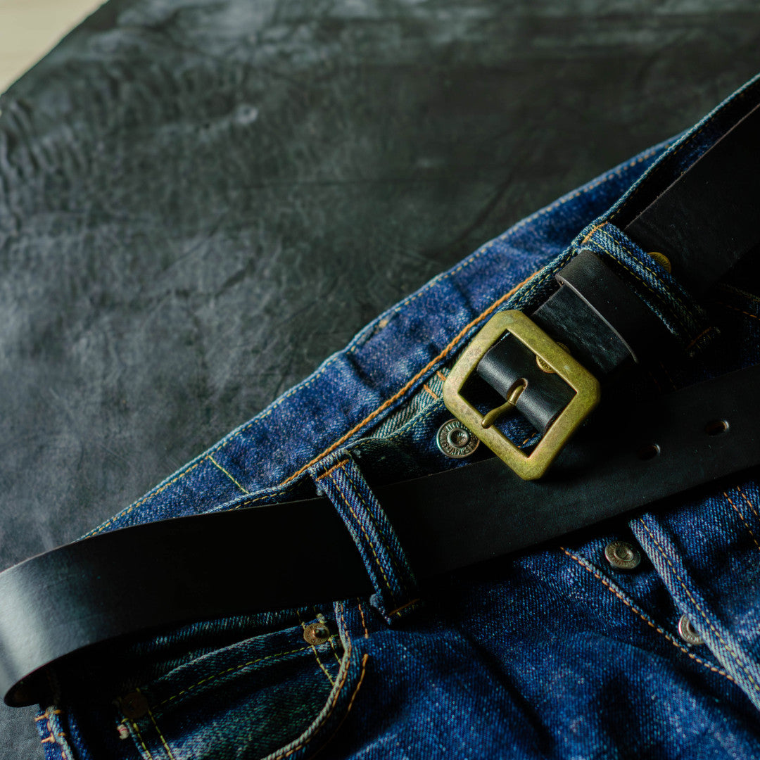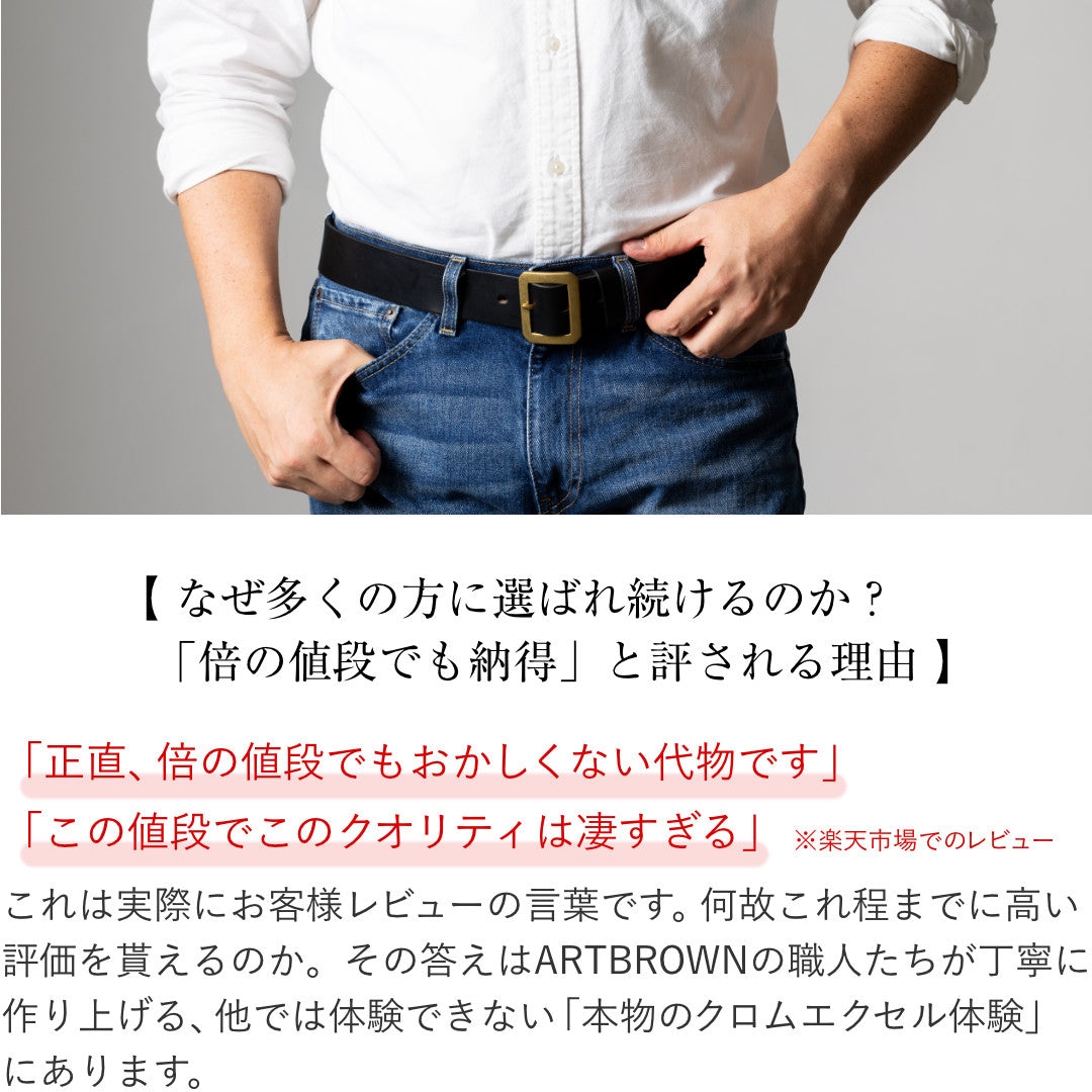 厚革でしなやかなクロムエクセルレザー、真鍮バックル、アートブラウンの刻印が入ったオリジナルホックなどベルト全体でヴィンテージな雰囲気を感じさせます。