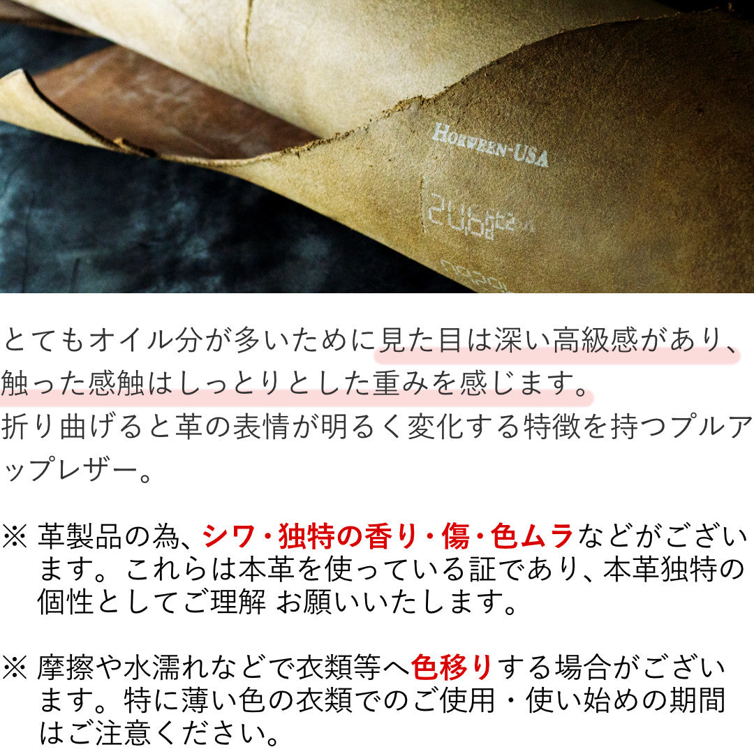 引っ張ると色が明るくなり印象の変わるプルアップレザーの特徴を持ち、通常のオイルドレザーに比べて革の繊維内により多くのオイル分が含まれています。